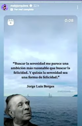 Hace unos días, Maly compartió una frase de Jorge Luis Borgues que señala: "Buscar la serenidad me parece una ambición más razonable que buscar la felicidad y quizás la serenidad sea una forma de felicidad".