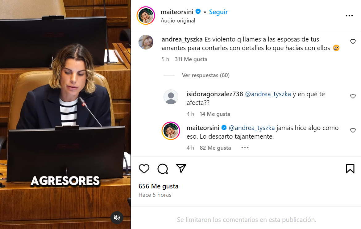 El comentario no resultó indiferente para Maite Orsini, quien decidió responderle en el mismo comentario, negando categóricamente que se hubiera contactado con la animadora para ponerla en aviso por la infidelidad.