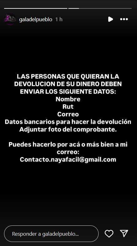 “Las personas que quieran la devolución de su dinero deben enviar los siguientes datos”, escribió en una historia donde puntualizó que deben escribir su nombre, rut, correo, datos bancarios y comprobante de la donación.