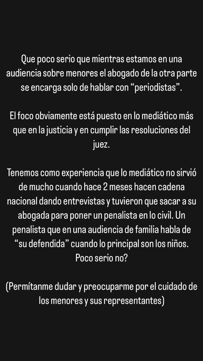 Sin embargo las declaraciones de la defensa no fueron del agrado de Icardi, quien arremetió en su cuenta de Instagram: "Qué poco serio que mientras estamos en una audiencia sobre menores, el abogado de la otra parte se dedica a hablar con periodistas".