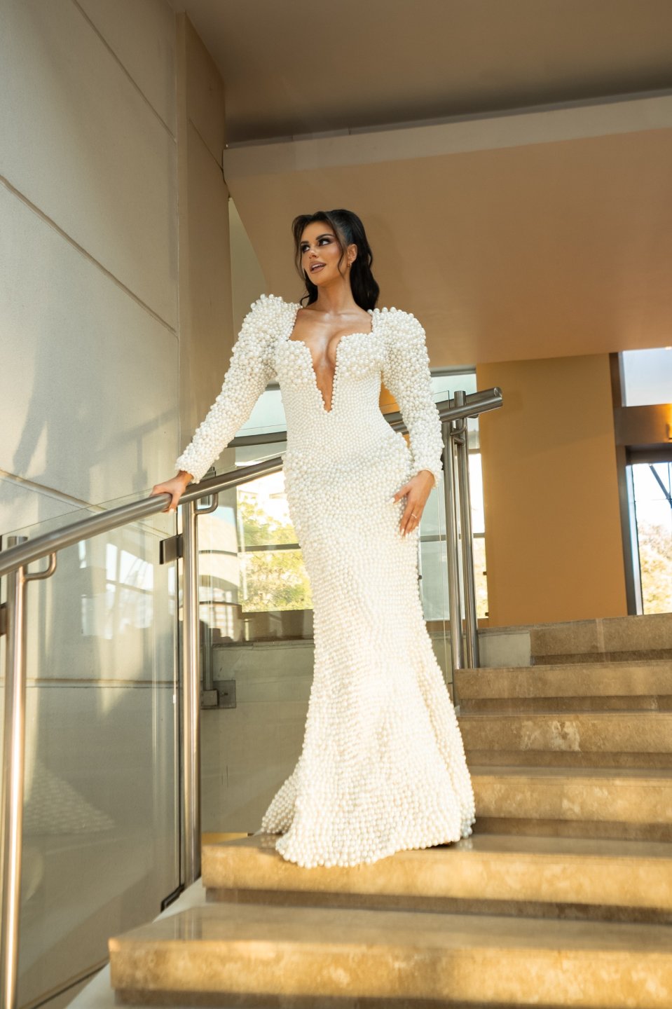 La joven impactó con un deslumbrante vestido de perlas reales, confeccionado en un proceso minucioso que tomó 21 días y requirió la costura a mano de 38.000 perlas de distintos tamaños.
