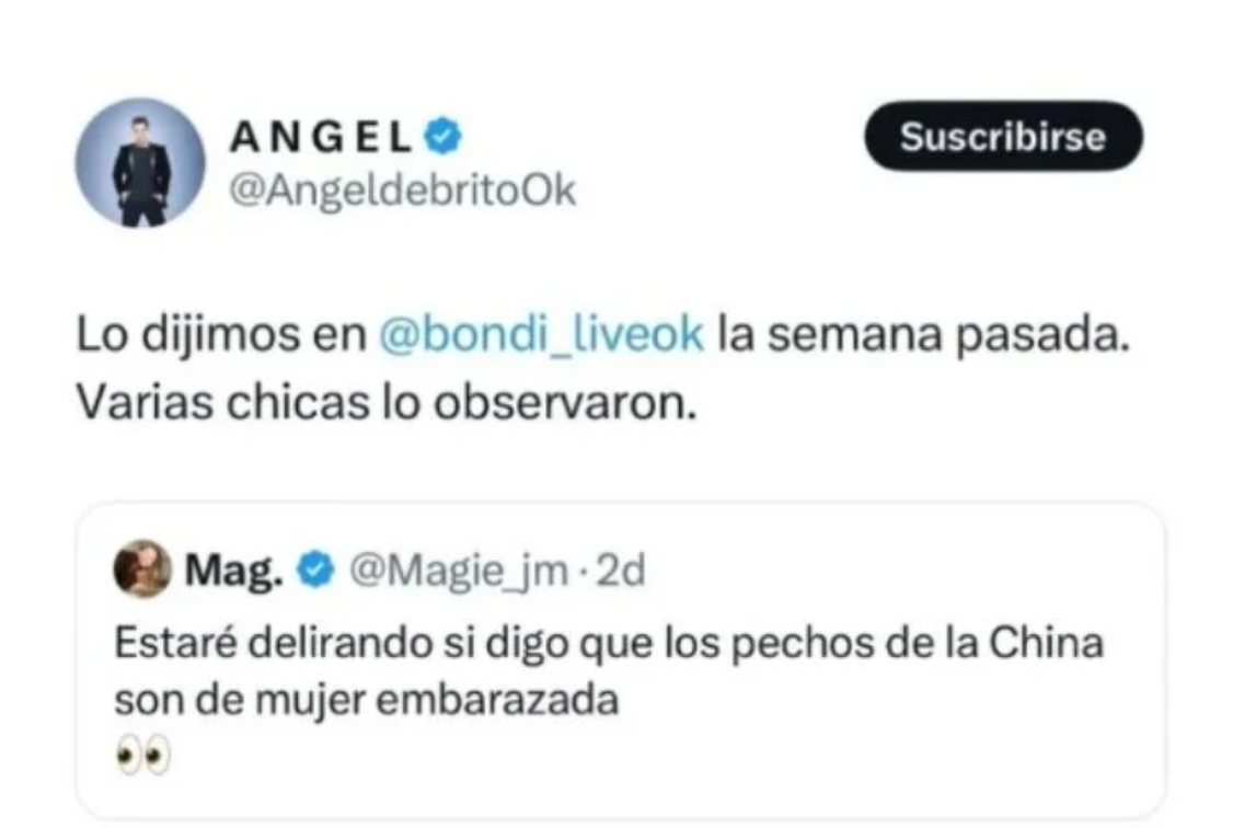 Una semana después, Ángel de Brito reposteó un tweet que decía: "Estaré delirando si digo que los pechos de la China son de mujer embarazada?" y alimentó los rumores al responder: "Lo dijimos en 'Bondi Live' la semana pasada. Varias chicas lo observaron".