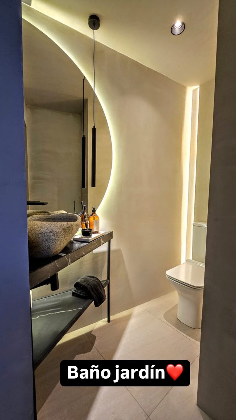 Calderón mostró cómo quedó el baño del jardín que cuenta con un lavamanos hecho de piedra, encimera de mármol, un gran espejo y luces LED para resaltar algunas zonas, lo que fue compartido por Rebeca Naranjo en su propia cuenta de Instagram.