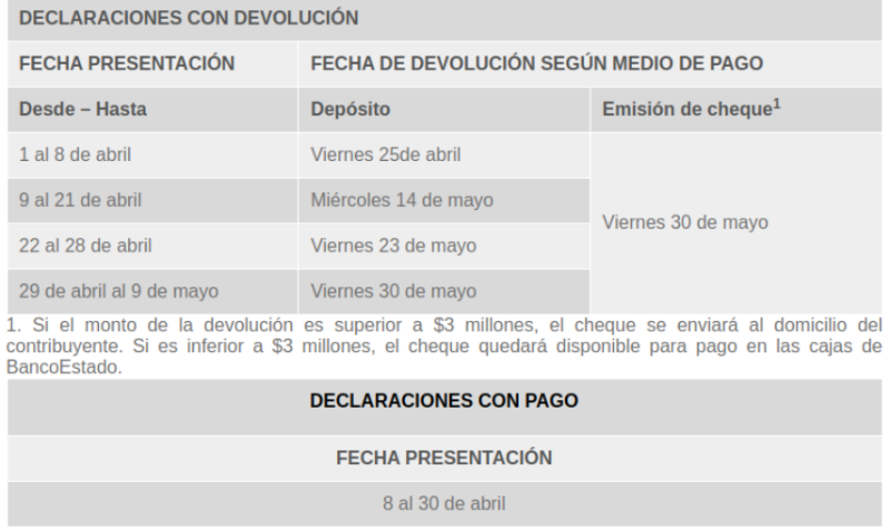 En ese sentido, agregaron que las primeras devoluciones serán pagadas vía depósito bancario por la Tesorería General de la República el próximo sábado 26 de abril.