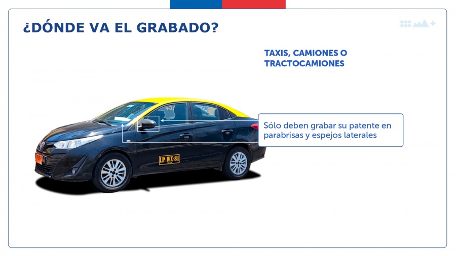 En el caso de aquellos vehículos que cuenten con su patente pintada en los costados, como taxis o camiones, estos deberán tener grabado sólo en los espejos laterales y parabrisas.