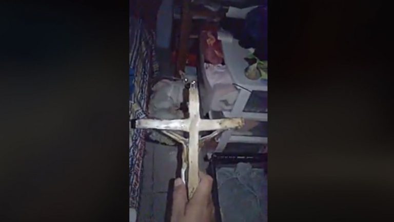 En las imágenes se ve como el dueño entra con su cámara en una mano y en la otra con un crucifijo, el que enloquece al perro cada vez que lo acerca a su cuerpo.