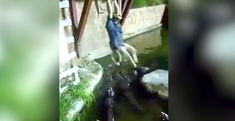 “The Gator Crusader”, como es conocido el entrenador, tomó la cuerda ubicada por encima de su cabeza y al más puro estilo de Tarzán, se lanzó sobre estos parientes de los dinosaurios, sin saber que la soga se cortaría por el peso.