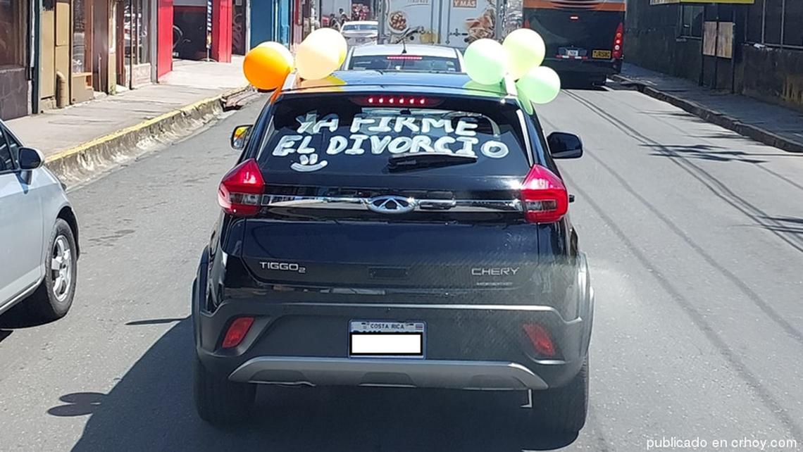 Se trata de Pablo Campos, un hombre que pintó los vidrios de su vehículo con la frase “ya firmé el divorcio”, lo llenó de globos y salió a andar por las calles de Cartago durante el pasado sábado.