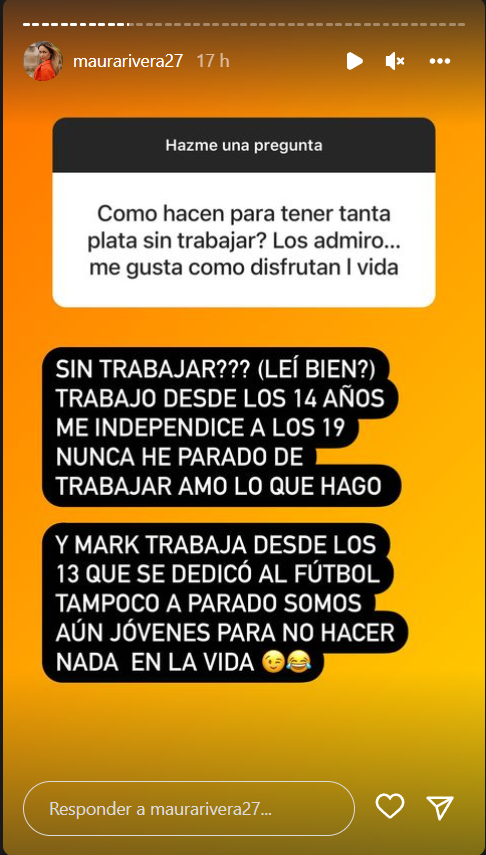 “Mark trabaja desde los 13, se dedicó al fútbol. Tampoco ha parado. Somos aún jóvenes para no hacer nada en la vida”, espetó Rivera, dejando en claro que "nada" está lejos de lo que ella hace con su vida.
