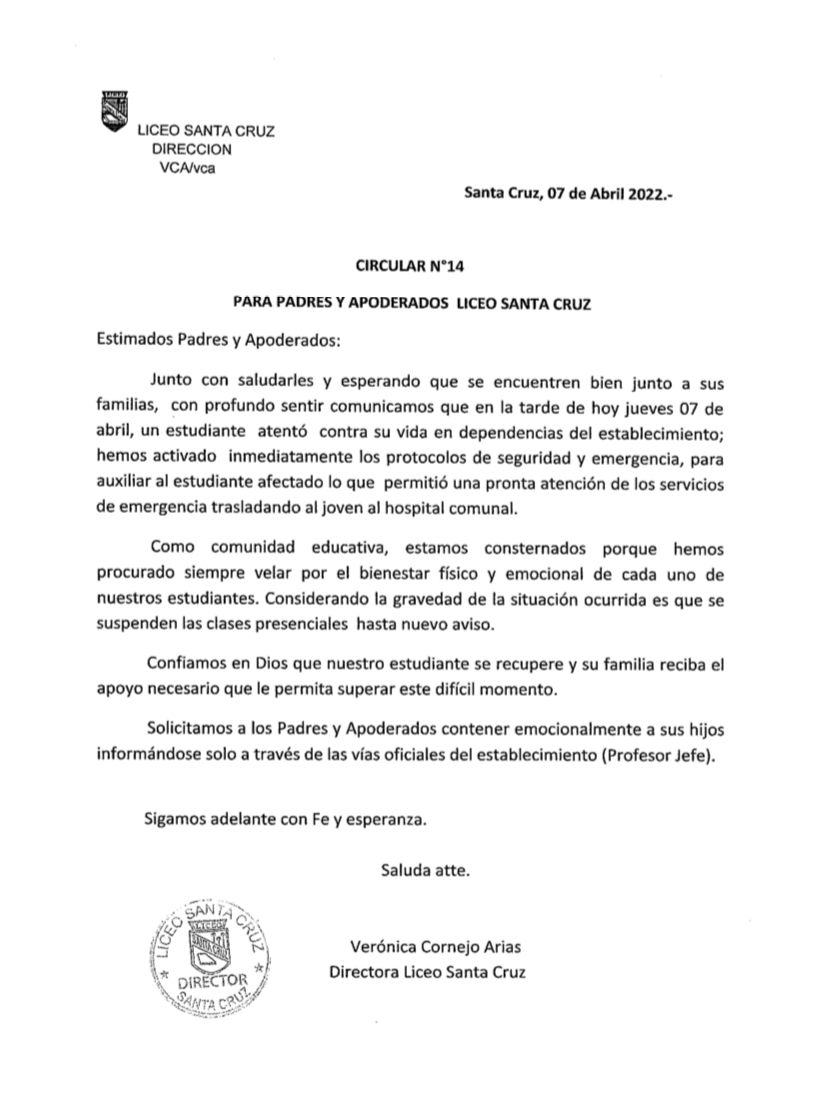 "Con profundo sentir comunicamos que un estudiante atentó contra su vida en dependencias del establecimiento. Hemos activados los protocolos de seguridad y emergencia para auxiliar al estudiante afectado lo que permitió una pronta atención de los servicios de emergencia, trasladando al joven al hospital comunal", indicaron desde el liceo en un comunicado.