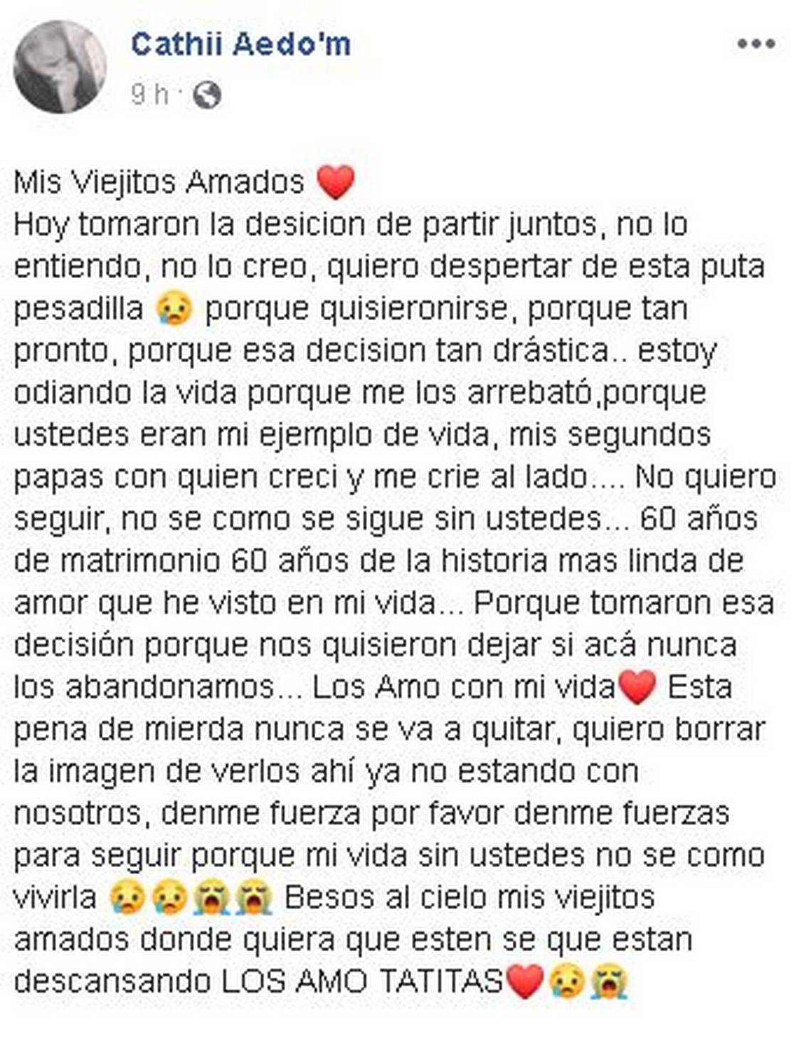 A través de un emotivo mensaje publicado en Facebook, Catherine Aedo manifestó su pesar por la muerte de sus abuelos en circunstancias que aún son investigadas.