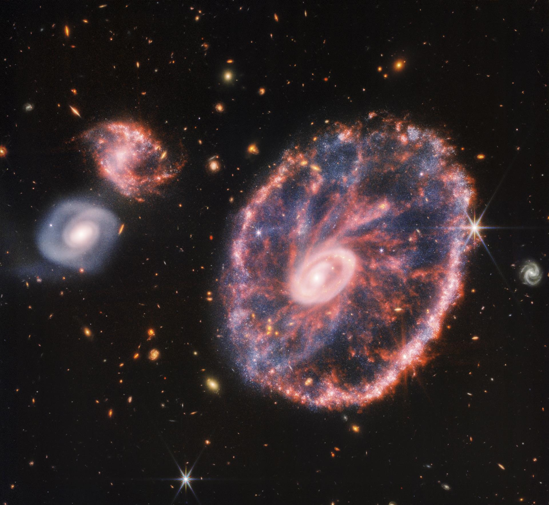 Esta peculiar galaxia no se muestra sola. La potente mirada infrarroja del Webb ha logrado una instantánea detallada de Rueda de Carro, pero también de dos galaxias compañeras más pequeñas con un telón de fondo de muchas otras galaxias.