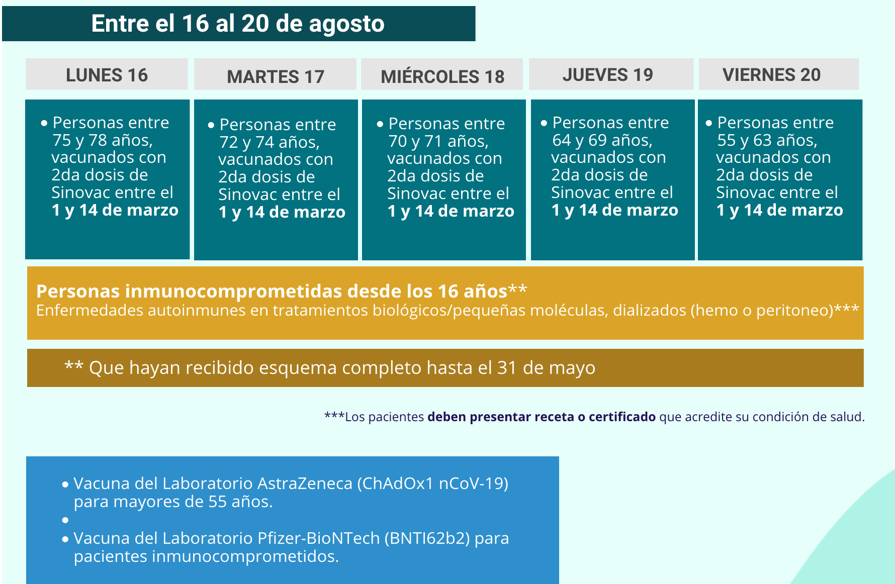 - Viernes 20 de agosto: Personas entre 55 y 63 años, vacunados con segunda dosis de Sinovac entre el 1 y 14 de marzo.