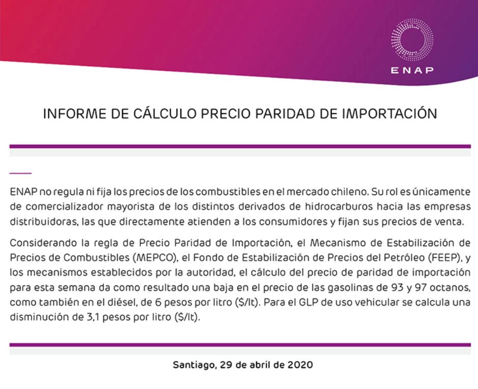 Según el informe semanal entregado por Enap, las gasolinas de 93 y 97 octanos tendrán una baja de $6 por litro. Mientras que, el gas licuado de uso vehicular bajará $3,1.