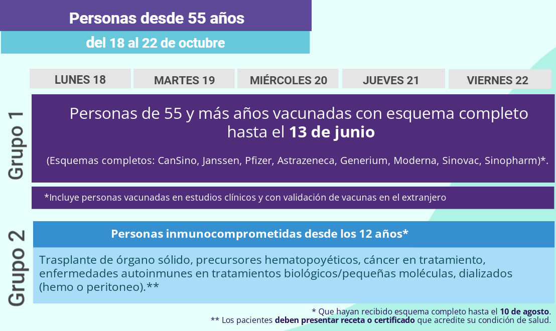 Por otro lado, los mayores de 55 años deben cumplir con los siguientes requisitos para inocularse este lunes 18 de octubre: