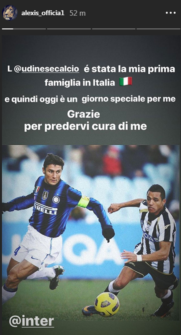 "Udinese fue mi primera familia en Italia y hoy es un día especial para mí. Gracias por cuidarme", escribió Sánchez en su primera historia, en la que además de etiquetar al Udinese etiquetó al Inter.