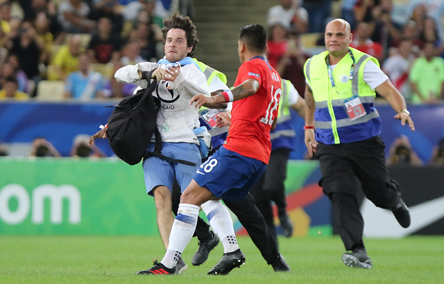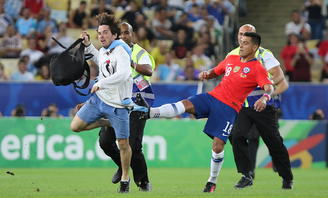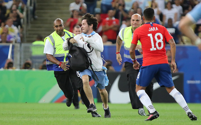 Hablamos de la invasión de un hincha a la cancha del estadio Maracaná, el que corrió por el césped y se puso una mascara de gallo. Hasta ahí, sólo una anécdota. Sin embargo, una inexplicable acción de Gonzalo Jara está dando la vuelta al mundo.