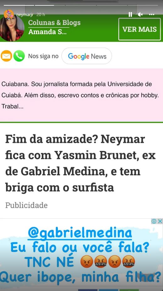 Se cansó y se lanzó con todo. Neymar cuestionó en duros términos los rumores que han circulado, y que ya fueron desmentido, que lo vincularían románticamente con Yasmin Brunet, ex pareja de Gabriel Medina, un conocido amigo del delantero.