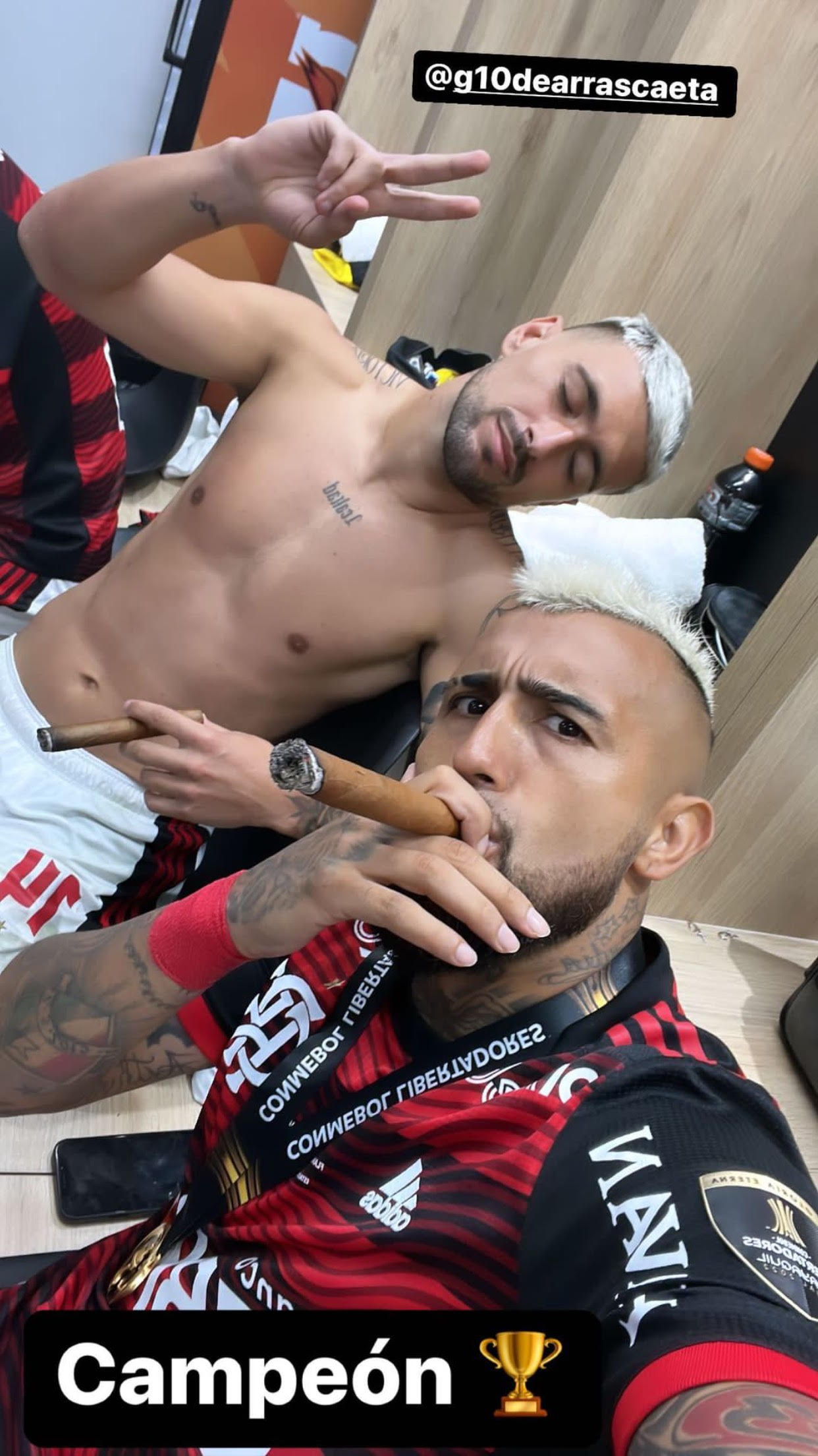 El volante nacional compartió una publicación de él junto a la copa. También, subió a sus historias una selfie junto al uruguayo, Giorgian De Arrascaeta. En la foto ambos están compartiendo unos cigarros puro, y en ella el "King" escribió "campeones".
