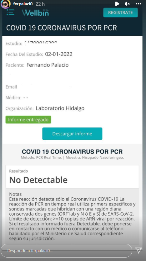 Además, Palacio enfatizó en que “me hice un estudio porque mañana (hoy) tengo que viajar a Uruguay y no tengo COVID-19, ahora se los muestro, así que a todos los que me tiran las malas, un beso”.