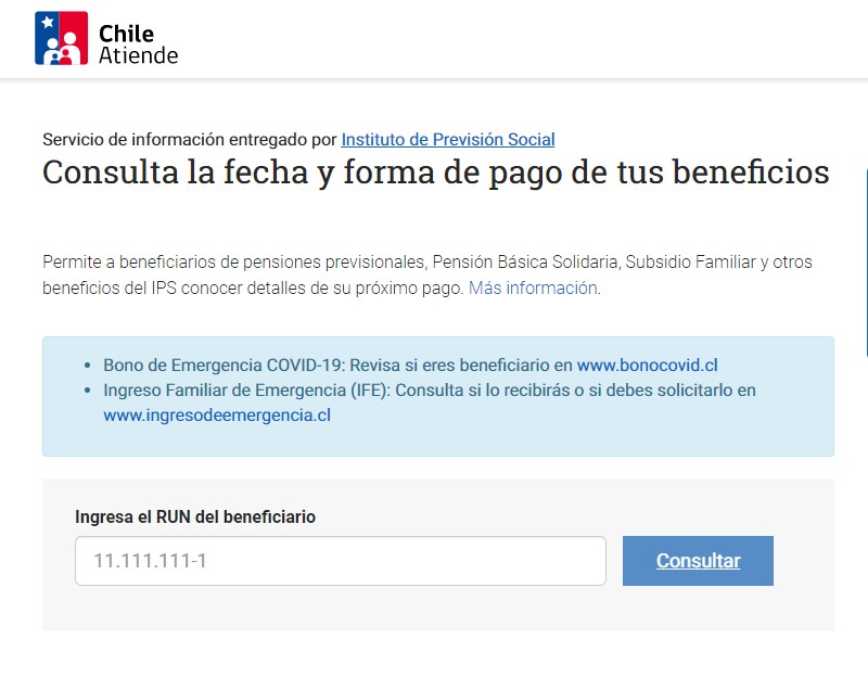 En el caso del IPS, los beneficiarios son los siguientes: pensionados de las ex cajas de previsión, personas con Pensión Básica Solidaria (PBS), pensionados de leyes especiales (Exonerados Políticos, Rettig, Valech, Indemnizaciones del Carbón), beneficiarios del Subsidio por Discapacidad Mental (Art. 35 de la Ley N° 20.255).