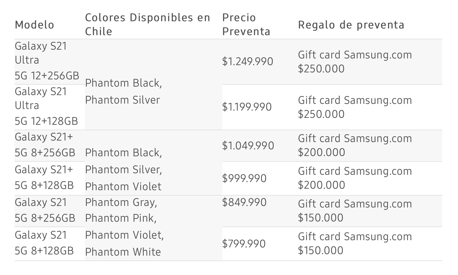 En detalle, las compras en preventa de Galaxy S21 llevan consigo una gift card de $150.000, las de Galaxy S21+ una de un valor de $200.000, y las de Galaxy S21 Ultra contarán con una gift card a canjear de $250.000.