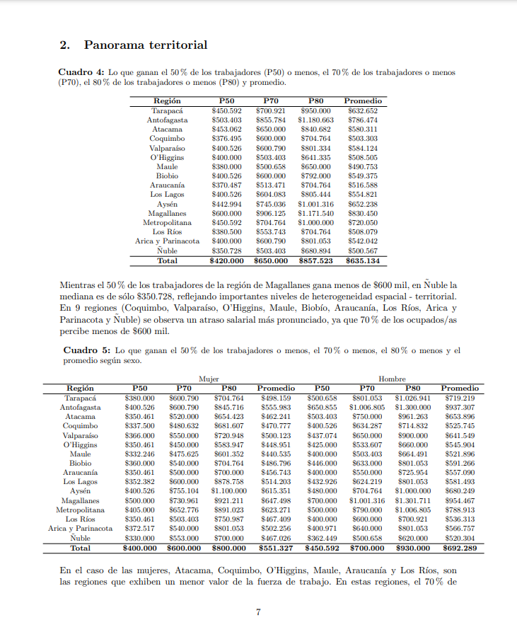 Con respecto a la división territorial, en las regiones de Coquimbo, Valparaíso, O’Higgins, Maule, Biobío, Araucanía, Los Ríos, Arica y Parinacota y Ñuble, se demuestra la existencia de un atraso salarial más pronunciado con respecto a otras regiones, ya que el 70 % de los ocupados/as percibe menos de $600 mil.