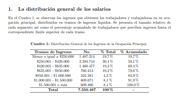 Lee también: Llevan años esperando sus viviendas: Familias se tomaron la Municipalidad de Puente Alto exigiendo una respuestaAsimismo, el 69,4 % de los trabajadores gana menos de $635.000. El 79,6 % de los trabajadores, menos de $850.000 y sólo el 16,1 % obtiene una renta de más de $1.000.000.