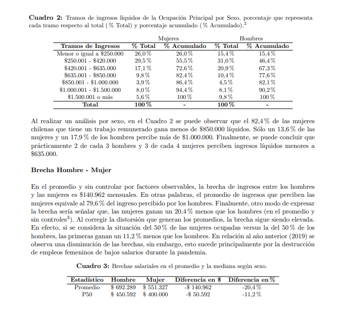 Según el documento estadístico, en promedio y sin controlar por factores observables, la brecha de ingresos entre los hombres y las mujeres es $140.962 mensuales. Es decir, que las mujeres ganan un 20,4 % menos que los hombres.