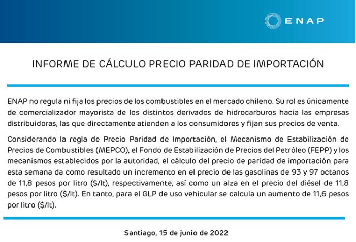 De acuerdo a lo señalado por la Empresa Nacional del Petróleo (ENAP), las bencinas de 93 y 97 octanos subieron un total de 11,8 pesos por litro ($/lt).