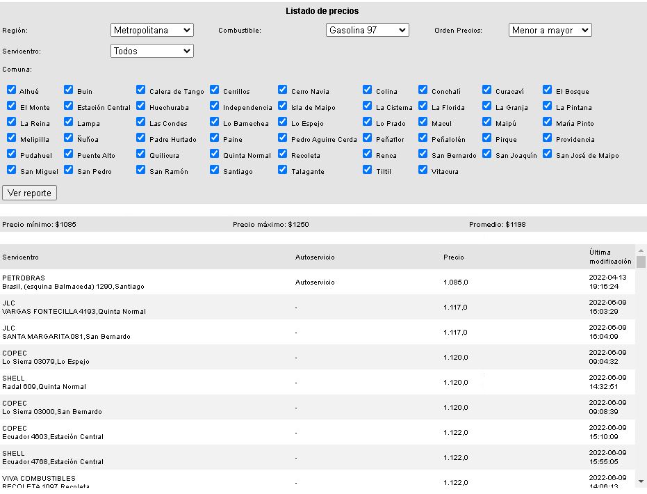 Por ejemplo, en una búsqueda rápida hecha en la Región Metropolitana, aparece que la bencina de 97 octanos más barata está en Santiago centro, Quinta Normal, San Bernardo y Lo Espejo.