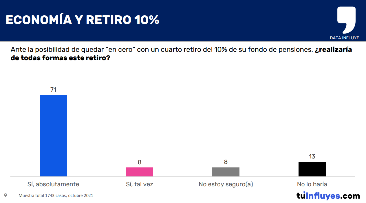 Con la pregunta: “Ante la posibilidad de quedar en cero con un cuarto retiro del 10% de sus fondos de pensiones, ¿Realizaría de todas formas este retiro?”, el 71% contestó “sí, absolutamente”.