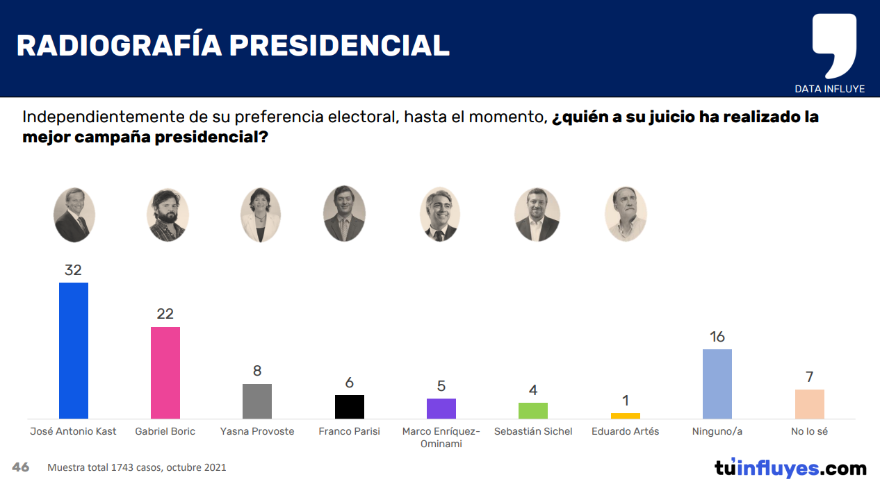 En tanto, Data Influye también consultó a los encuestados sobre quién estaba realizando la mejor campaña presidencial independiente de la preferencia electoral, consigna que es liderada por amplio margen por Kast.