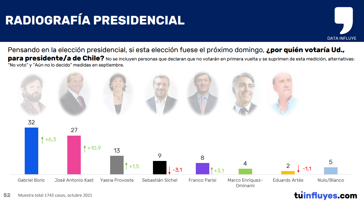 Más atrás quedan Provoste (13%), Sebastián Sichel (9%), Franco Parisi (8%), Marco Enríquez-Ominami (4%) y Eduardo Artés (2%).