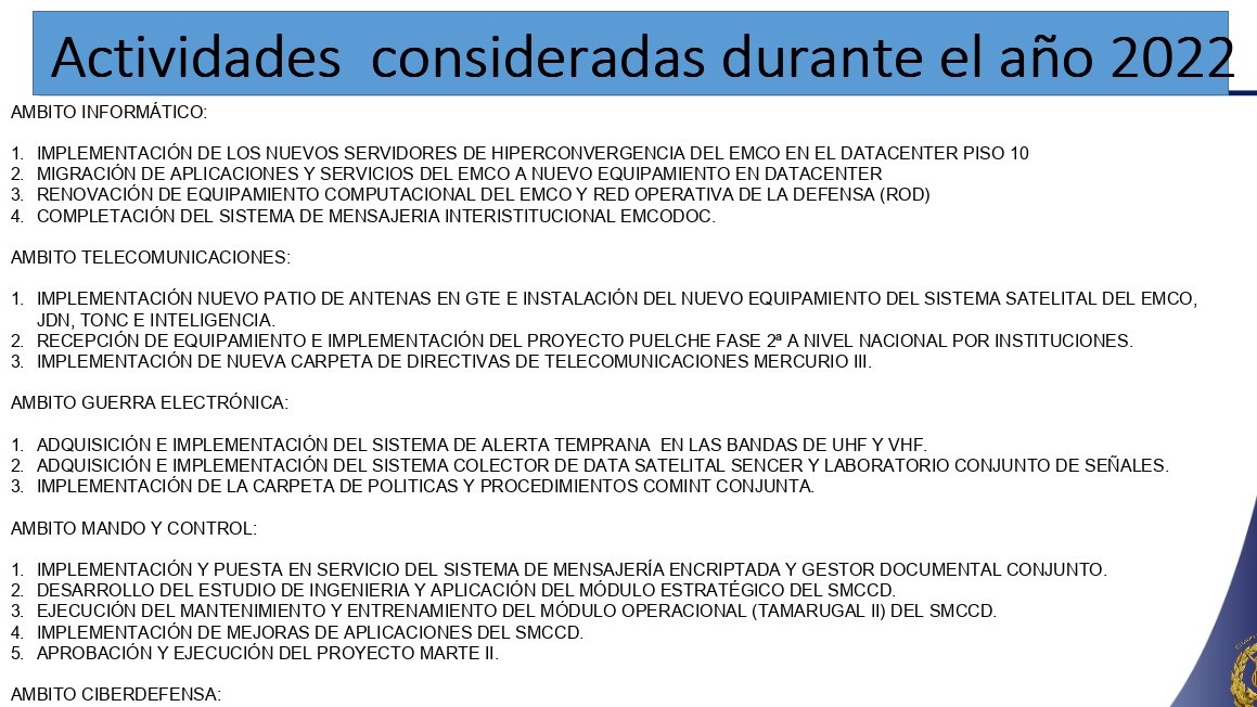También se instalarían computadores más modernos y la “red operativa de la Defensa” se modernizaría con un nuevo “datacenter”. Y por si fuera poco, se completaría un sistema institucional de mensajería encriptada, con miras a mejorar la seguridad, incluyendo un nuevo “patio” de antenas satelitales que permitirían coordinar al EMCO, la Jefatura de la Defensa Nacional y el Teatro de Operaciones Norte Conjunto de Inteligencia.