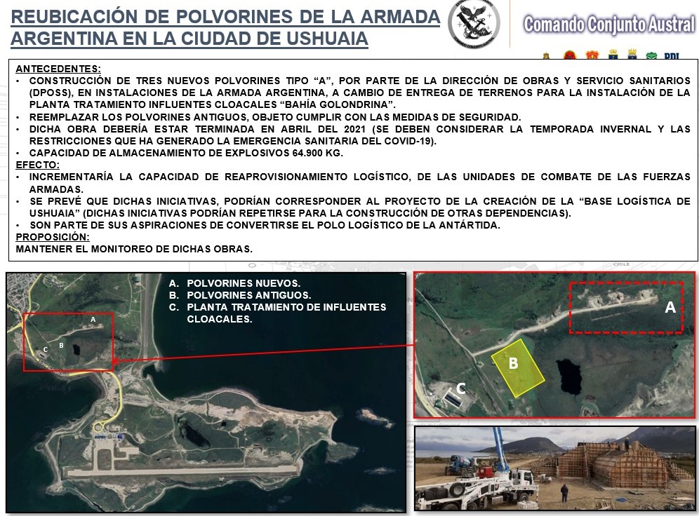 Sin embargo, hay otros que dan cuenta de la preocupación chilena en la zona magallánica, por la construcción de tres nuevos polvorines en la zona de Ushuaia, Argentina, con capacidad para almacenar 69.400 toneladas de explosivos.