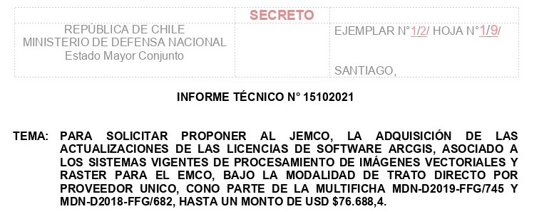 Espionaje o la natural preocupación de las FF.AA. nacionales, lo cierto es que en materia de imágenes tomadas desde el cielo, el EMCO enfrenta problemas: existe en Chile un solo proveedor oficial de software para la lectura de imágenes. De allí que la entidad prefiera el trato directo por 77 mil dólares con la empresa ESRI que, en todo caso, tiene vasta experiencia con el Estado y firmas privadas.