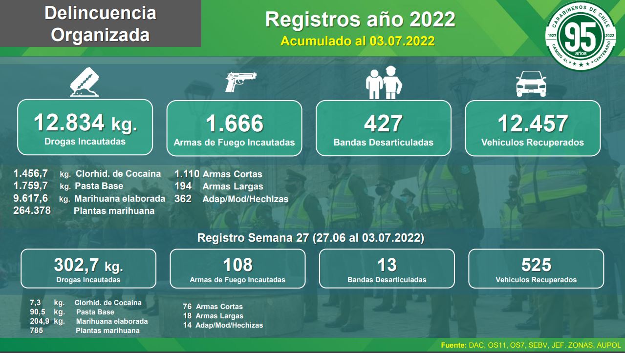 “Estas cifras, además de reflejar el trabajo incansable de nuestros carabineros, dan cuenta de un fenómeno delictual que hemos estado monitoreando y abordando de manera especial”, destacó el director nacional de Orden y Seguridad, el general inspector Marcelo Araya Zapata.