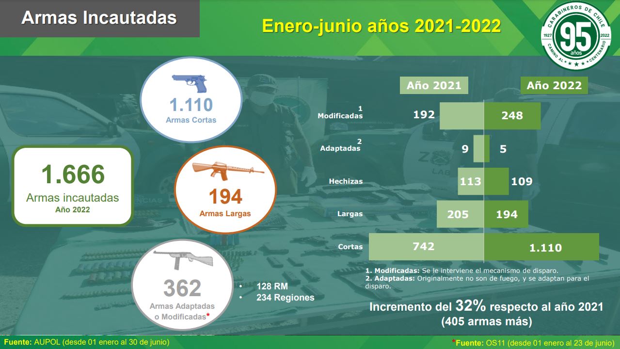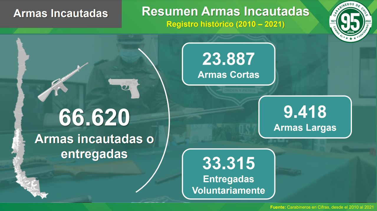Al respecto, el general inspector Zapata agregó que, entre 2010 y 2021, Carabineros registra un total de 66.620 armas incautadas o entregadas.