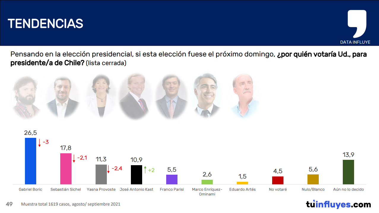 Finalmente la carrera presidencial arrojó que Gabriel Boric lidera la encuesta con un 26,5%, seguido de Sebastián Sichel con un 17,8. Luego aparece Yasna Provoste con un 11,3%, Jose Antonio Kast con un 10,9%, Franco Parisi con un 5,5%, Marco Enríquez-Ominami con un 2,6%, Eduardo Artes con un 1,5%. En ese sentido consignar que el 13,9% aun no decide por su candidata o candidato.