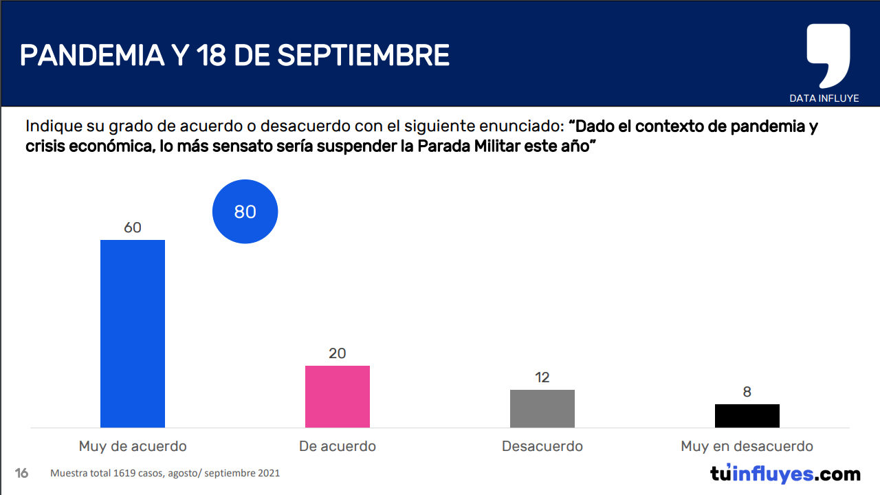 En ese mismo contexto, un 80% de las y los entrevistados confirmó que lo más sensato sería suspender la Parada Militar el próximo 19 de septiembre de 2021. Lo anterior, luego que se informara que desde el Gobierno junto con el Ministerio de Salud se encuentran trabajando en un protocolo para la realización del evento.