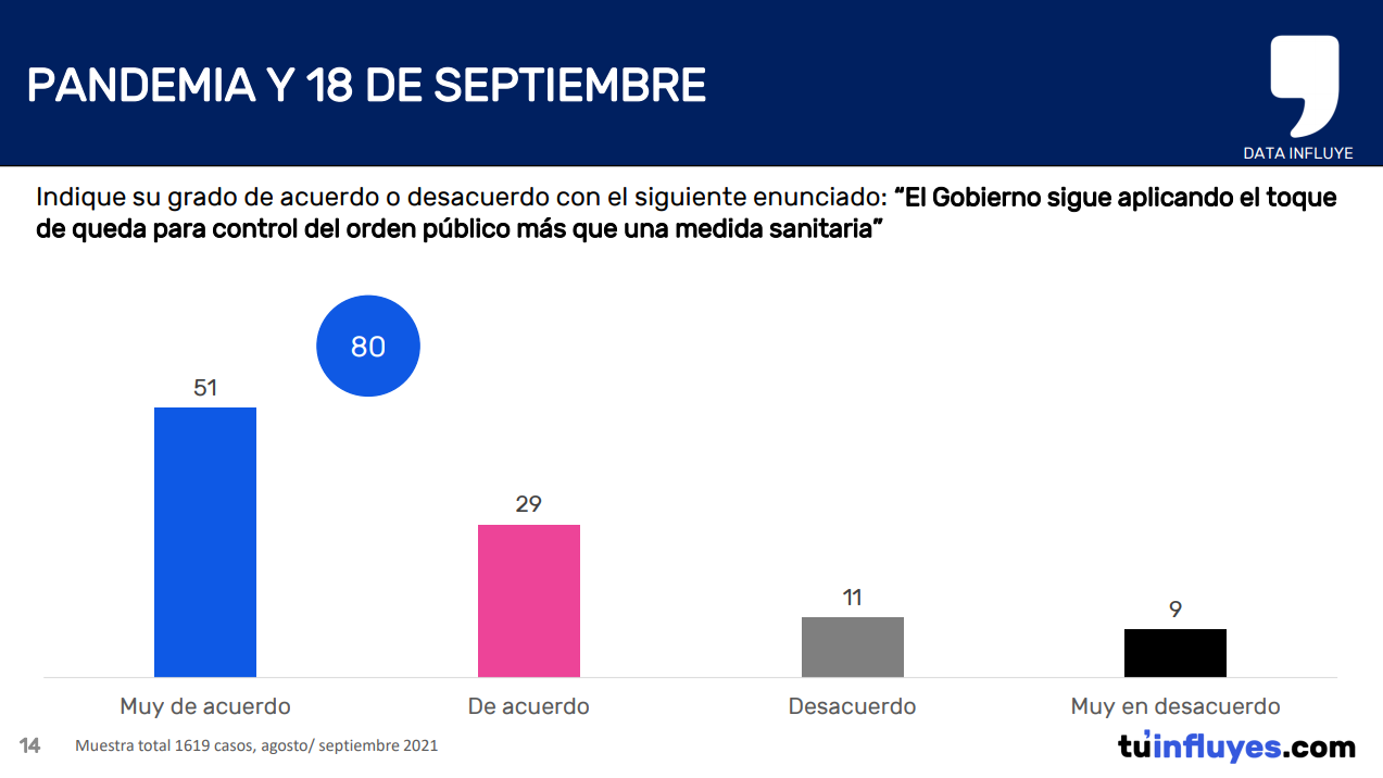 Con relación al toque de queda que en la actualidad se efectúa entre la medianoche y las 05:00 horas, un 80% las personas indicó que las autoridades siguen aplicando la medida para un control de orden público más que una medida sanitaria.