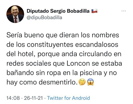 "Sería bueno que dieran los nombres de los constituyentes escandalosos del hotel, porque anda circulando en redes sociales que Loncon se estaba bañando sin ropa en la piscina y no hay como desmentirlo", indicó el parlamentario a través de su cuenta de Twitter.