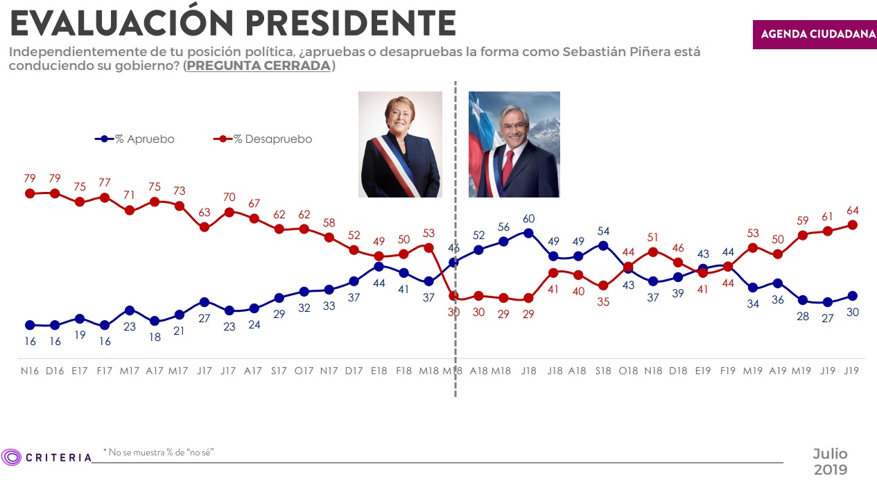 La encuesta Agenda Ciudadana Criteria correspondiente al mes de julio reveló que el apoyo a la gestión del presidente Sebastián Piñera subió tres puntos respecto al anterior sondeo, alcanzando un 30% de aprobación. Sin embargo, la desaprobación también aumentó la misma cantidad de puntos, llegando al 64%.