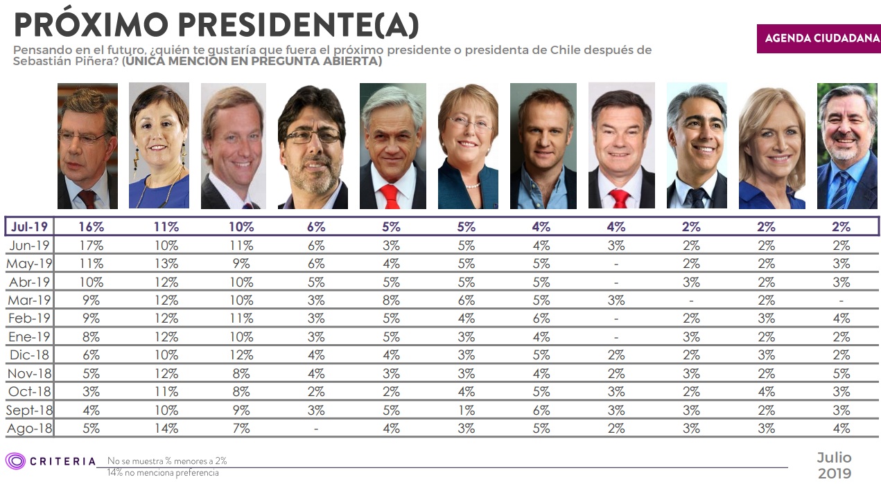Los resultados del sondeo de julio revelan que la aprobación al presidente se mantiene en números rojos. A la vez, Joaquín Lavín y Beatriz Sánchez lideran las preferencias presidenciales.