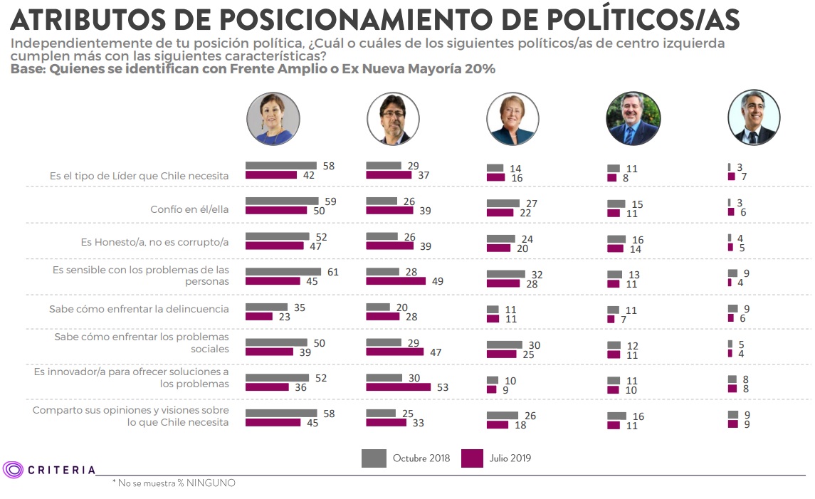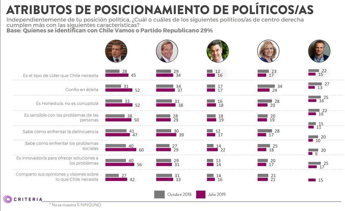 En el caso del sector que se identifica con Chile Vamos o el Partido Republicano, se revela un alza de entre 12 y 20 puntos en 7 de los 8 atributos consultados, imponiéndose por sobre los otros líderes del sector como José Antonio Kast y Evelyn Matthei.