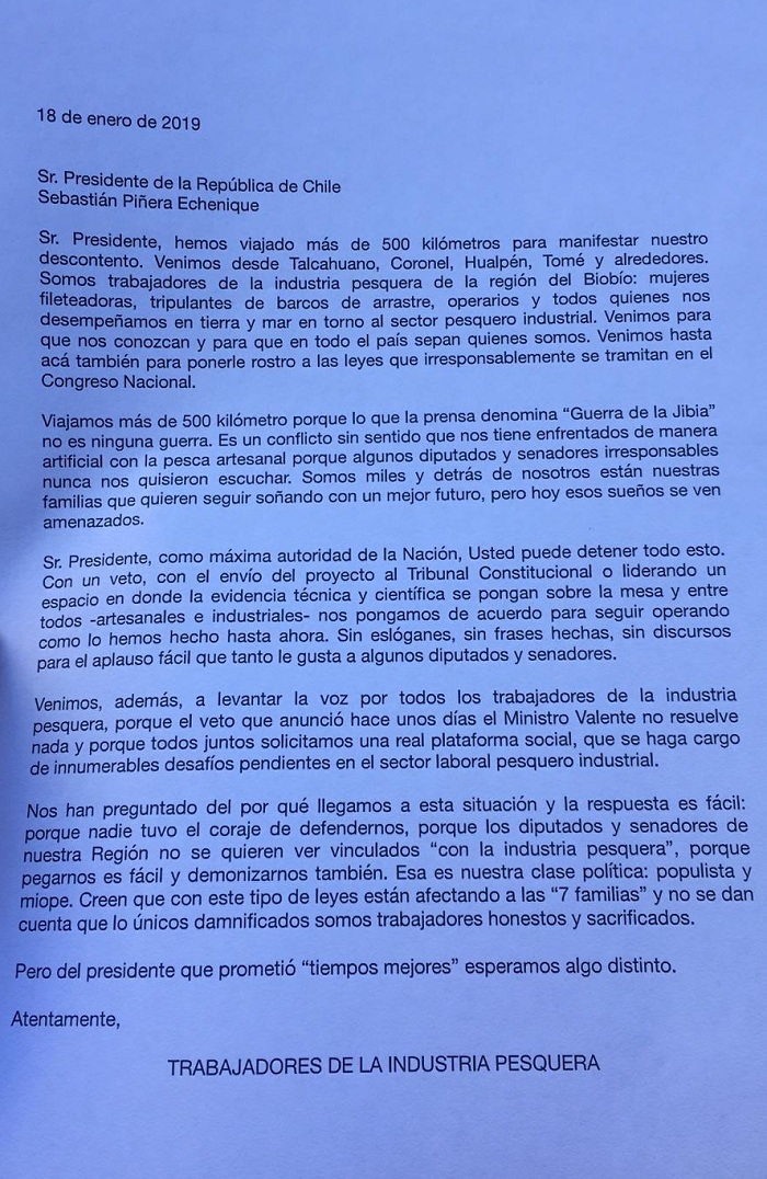 "Hemos viajado más de 500 kilómetros para manifestar nuestro descontento. Venimos desde Talcahuano, Coronel, Hualpén, Tomé y alrededores. Somos trabajadores de la industria pesquera de la región del Biobío: mujeres fileteadoras, tripulantes de barcos de arrastre, operarios y todos quienes nos desempeñmos en tierra y mar en torno al sector pesquero industrial", comienza la carta.