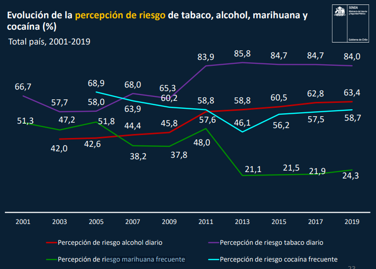 En cuanto a la percepción de riesgo por cada sustancia, una de las percibidas como menos riesgosas es la marihuana en su uso frecuente con un 24,3%, mientras que una de las más peligrosas el tabaco en su uso diario con un 84%.