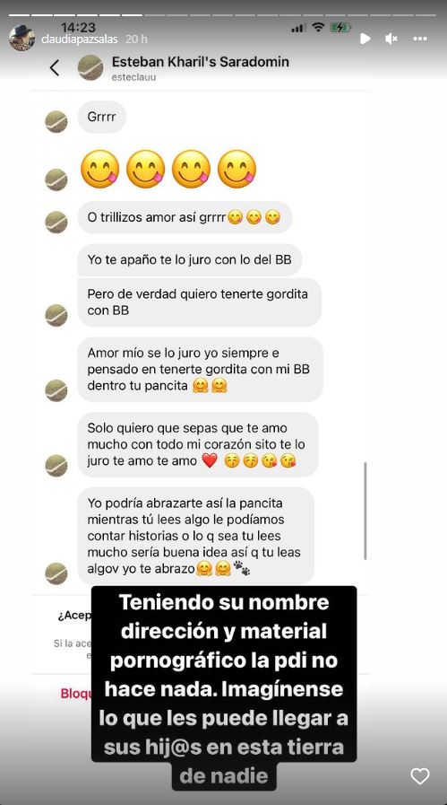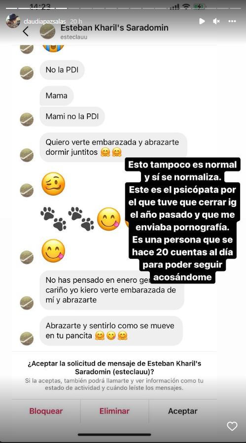 Claudia Salas contó a través de sus stories de la red social que el individuo "se hace 20 cuentas al día para poder seguir acosándome". Además, llamó a concientizar sobre los peligros y la desregulación que existe en estas plataformas.