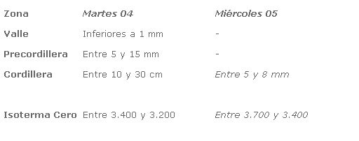 De acuerdo a la información dispuesta por la Dirección Meteorológica de Chile y la Onemi, éstas serán de forma aislada, en forma de nieve y aguanieve en la cordillera, y líquida en la precordillera. Se espera además el desarrollo de tormentas eléctricas, condición que está asociada al avance de una baja segregada.